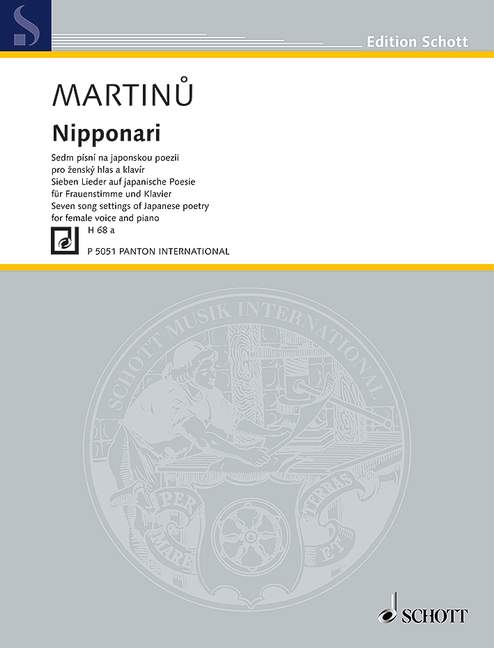 タイトルからもわかるように、チェコの作曲家マルティヌー(1890-1959)が1912年に作曲した、額田王や小野小町など日本の古代の詩からインスピレーションを得て創作した歌曲集です。当初からオーケストラ版とピアノ版が作られ、ピアノ版はこれが初出版です。 MARTINU, BohuslavNipponari H 68: 7 Songs on Japanese Poetry(Female Voice & P)/Czech,G,EB. Schott'S Sohne/Mainz