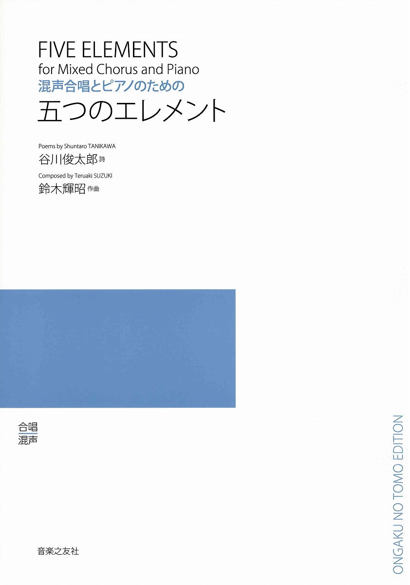 世界(宇宙)を構成するとされる五つの要素『木、水、火、光、地(五行の思想では光でなく金)』がテーマとなっている谷川俊太郎の詩をテキストにして作曲。全体は大きく三つの部分からなり、「木」ー「水」が第一の部分、「火」が第二の部分、「光」ー「地」が第三の部分で構成される。それぞれのエレメントによって表象される様々な諸相が、動きのある音楽的な起伏の中で描かれ、その各曲の性格、方向性、色彩の違いを色濃く、鮮やかに演奏されることが求められている。