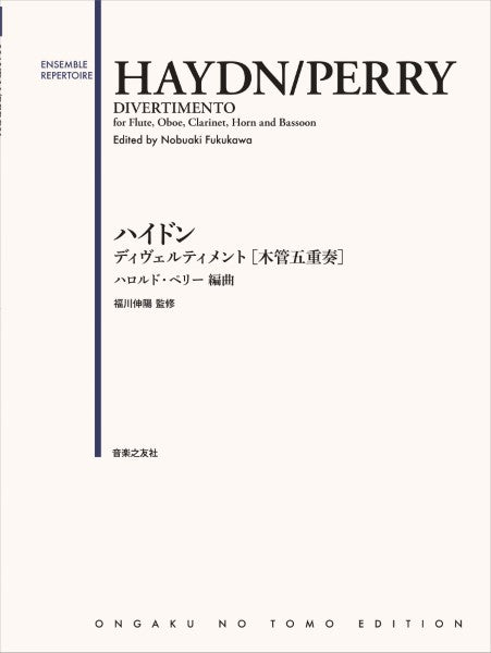 ハイドンの真作かどうかは疑わしいとされつつも「ハイドンのディヴェルティメント」として定着した、木管五重奏の主要レパートリー。古典のなかで最も演奏される名曲の貴重な国内版となる。原曲の管楽八重奏曲を、アメリカの編曲家ハロルド・ペリーが木管五重奏曲にアレンジしたもの。各楽章の生き生きとした主題と素朴であいらしい響きが魅力。第2楽章〈聖アントニのコラール〉の旋律は、ブラームス《ハイドンの主題による変奏曲》のテーマとしても知られている。個々に要求される技術的な難易度が比較的やさしく、演奏時間も10分程と木管五重奏の入門編としてもよく取り上げられる。