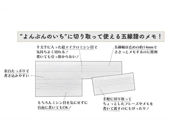 かわいらしい表紙をめくると、2段の五線譜が印刷された一筆箋サイズのメモ紙(メモ紙部分にイラストはありません)が。そのメモ紙部分には十文字に入ったミシン目があり、そこから切り離すとそれぞれ均等なサイズ(よこ94mm×たて40mm)になります。メモして、切って、必要な部分だけを貼り付けて。持ち歩きにもじゃまにならないサイズで、ふとした拍子に思い浮かんだメロディやフレーズを書き留めておくのに便利です。