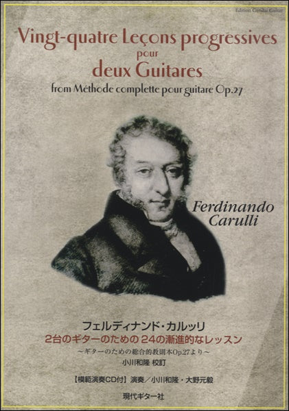本曲集はフェルディナンド・カルッリの『ギターのための総合的教則本 Op.27』より、第3部の二重奏用エチュード集「24の漸進的なレッスン」をオリジナル版・諸版を参考にしながら校訂を加え編纂したものです。オリジナル版の明らかなミスや疑問点を修正し、読みやすい現代譜として再現。実用的原典版と呼べる内容となっております。「24の漸進的なレッスン」はいずれも、「生徒」と「先生」のパートから成り、教室のレッスンに最適。「生徒」のパートはとてもシンプルで非常にやさしく、この作品を練習することで次第に力がつき、合奏のパートにも慣れることが出来るでしょう。「先生」のパートはより複雑ですが、伴奏を学ぶのに必須の24曲です。やさしく、弾きやすく、そして親しみやすいメロディーを持つ小品が揃う「24の漸進的なレッスン」です。校訂者の小川和隆とその愛弟子、大野元毅による模範演奏CD付き。CDを聴くだけでも、良質な古典作品に親しむことが出来ます。