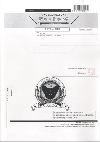 クラリキャットシリーズ 楽譜『ジュ・トゥ・ヴ(Cl4)』 クラリネット四重奏