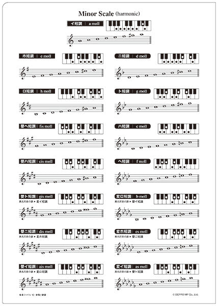 長音階と和声的短音階全種を鍵盤の位置と五線で示したA4用のクリアフォルダーです。