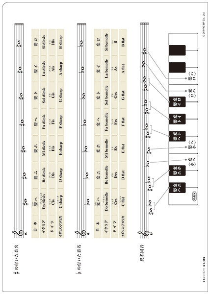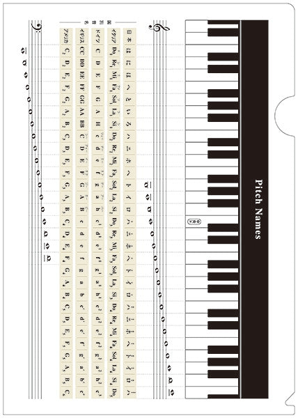 鍵盤、五線、4か国語(日本語・イタリア語・ドイツ語・英語)による幹音と派生音名の対象図を掲載したA4用のクリアフォルダーです。