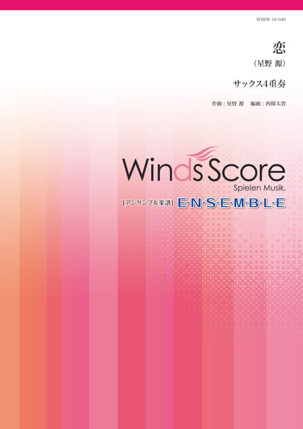 TBS系 火曜ドラマ「逃げるは恥だが役に立つ」主題歌の『恋』がサックス4重奏のアンサンブル譜になりました!イントロがはじまった瞬間からダンスフロアに連れ出されたような感覚に陥る、心躍るダンスナンバー。ドラマのエンディングで新垣結衣や星野源をはじめとする出演者が曲に合わせて踊る“恋ダンス”がSNS等で話題を集めています。歌って踊って楽しめる、大注目の楽曲です!明るく元気でカッコいいサウンド感は、サックスで演奏するのにぴったり!依頼演奏やコンサート等どんな演奏会でもお使いいただけます。演奏すれば盛り上がること間違いありません!