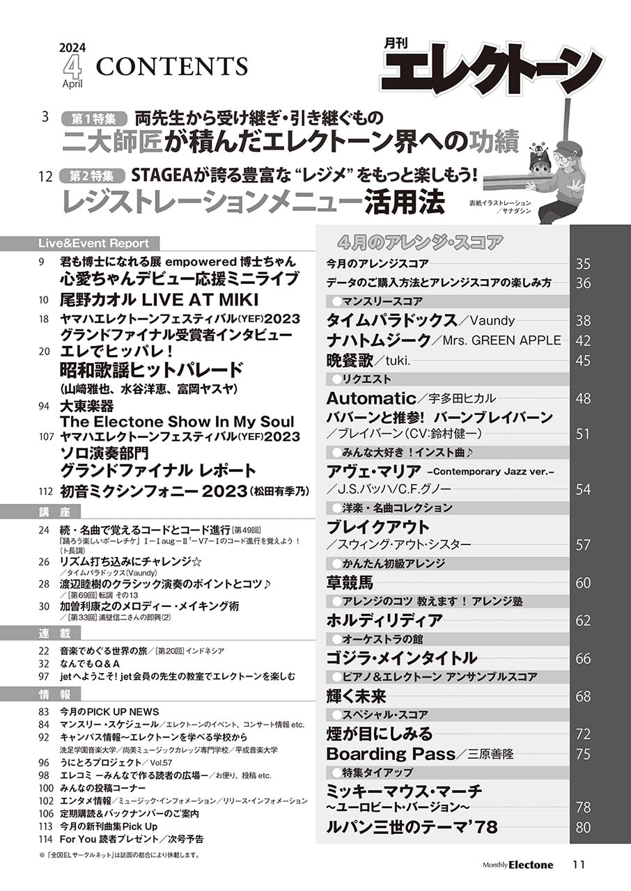 月刊エレクトーン2024年4月号は、【両先生から受け継ぎ・引き継ぐもの~二大師匠が積んだエレクトーン界への功績】と【STAGEAが誇る豊富な“レジメ”をもっと楽しもう!~レジストレーションメニュー活用法】の2大特集です。