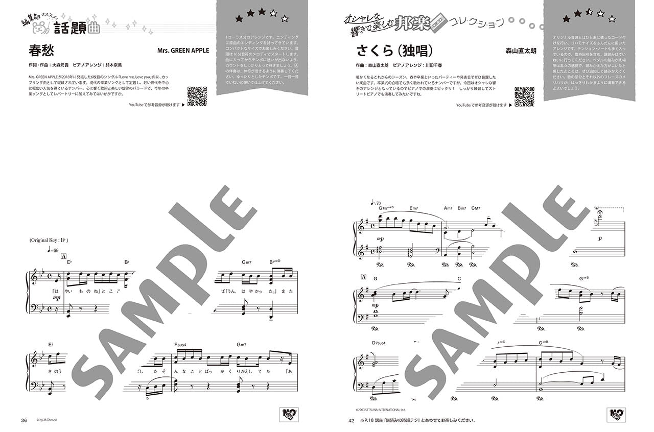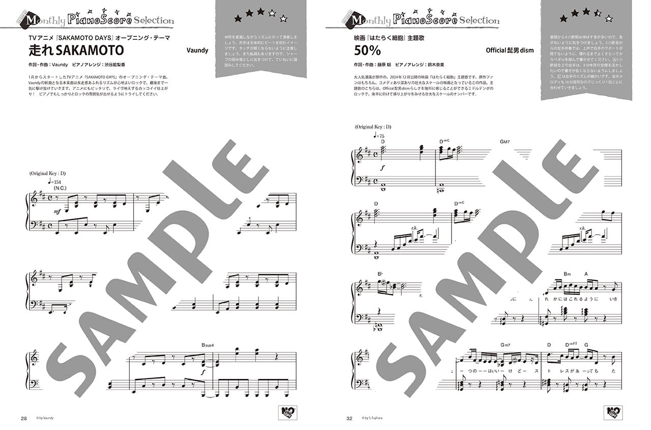 [1] 走れSAKAMOTO / Vaundy TVアニメ『SAKAMOTO DAYS』オープニング・テーマ 作曲: Vaundy 作詞: Vaundy 編曲: 渋谷 絵梨香 編成: ピアノ・ソロ 難易度: 中級 [2] 50% / Official髭男dism 映画『はたらく細胞』主題歌 作曲: 藤原 聡 作詞: 藤原 聡 編曲: 鈴木 奈美 編成: ピアノ・ソロ 難易度: 中級 [3] 春愁 / Mrs. GREEN APPLE 作曲: 大森 元貴 作詞: 大森 元貴 編曲: 鈴木 奈美 編成: ピアノ・ソロ 難易度: 中級 [4] 世界中の誰よりきっと(ハ長調ver.) / 中山美穂 & WANDS 作曲: 織田 哲郎 作詞: 上杉 昇/中山 美穂 編曲: 川田 千春 編成: ピアノ・ソロ 難易度: 初級 [5] さくら(独唱) / 森山直太朗 作曲: 森山直太朗 編曲: 川田 千春 編成: ピアノ・ソロ 難易度: 初中級 [6] The Rose / ベット・ミドラー 作曲: Amanda McBroom 編曲: 戸田 愛 編成: ピアノ・ソロ 難易度: 初中級 [7] 遠く遠く(フルサイズ) / 槇原 敬之 作曲: 槇原 敬之 作詞: 槇原 敬之 編曲: 川田 千春 編成: ピアノ・ソロ 難易度: 中級 [8] にじ(ト長調ver.) 作曲: 中川 ひろたか 作詞: 新沢 としひこ 編曲: 森 真奈美 編成: ピアノ・ソロ 難易度: 初級 [9] ハイ・ホー(ハ長調ver.) ディズニー映画『白雪姫』より 作曲: Frank Churchill 編曲: 川田 千春 編成: ピアノ・ソロ 難易度: 超入門 [10] Can You Keep A Secret? / 宇多田 ヒカル 作曲: 宇多田 ヒカル 編曲: ずっしー 編成: ピアノ・ソロ 難易度: 中級 [11] One more time,One more chance / 山崎まさよし 作曲: 山崎 将義 編曲: 事務員G 編成: ピアノ・ソロ 難易度: 中級 [12] 紅(イ短調ver.) / X JAPAN 作曲: YOSHIKI 編曲: 渋谷 絵梨香 編成: 連弾 難易度: 初級×中級 [13] グリーンスリーブス 作曲: TRADITIONAL 編曲: ござ 編成: ピアノ・ソロ 難易度: 中級 [14] ワルツ イ短調 遺作 (2024年発見) / ショパン 作曲: F.ショパン 編曲: 監修:岡部玲子 編成: ピアノ・ソロ 難易度: 中級 [15] 沈丁花(電P ver.) / DISH// 作曲: 北村 匠海/はっとり 編成: ピアノ・ソロ 難易度: 中級