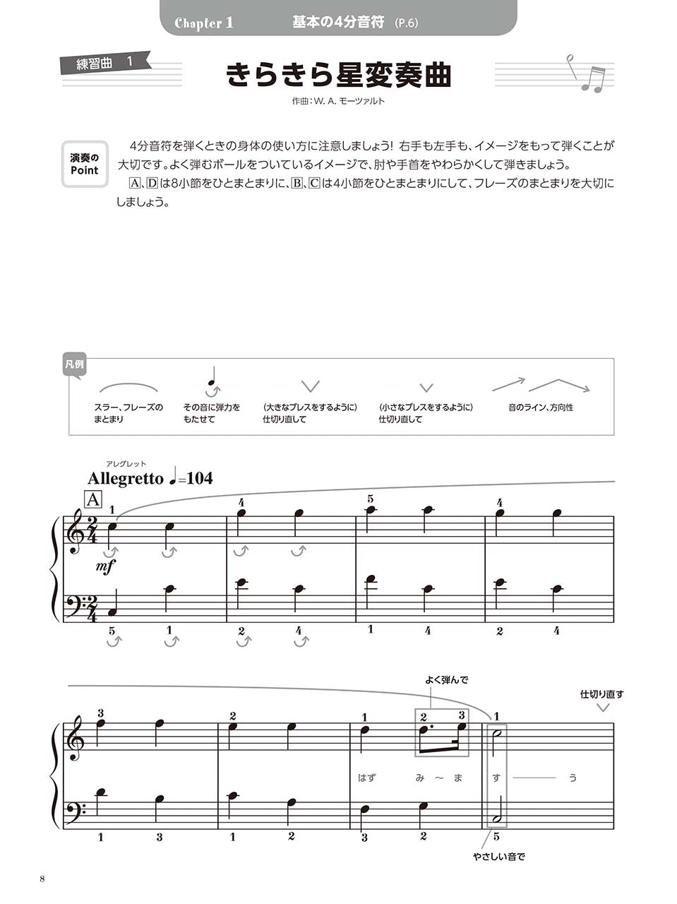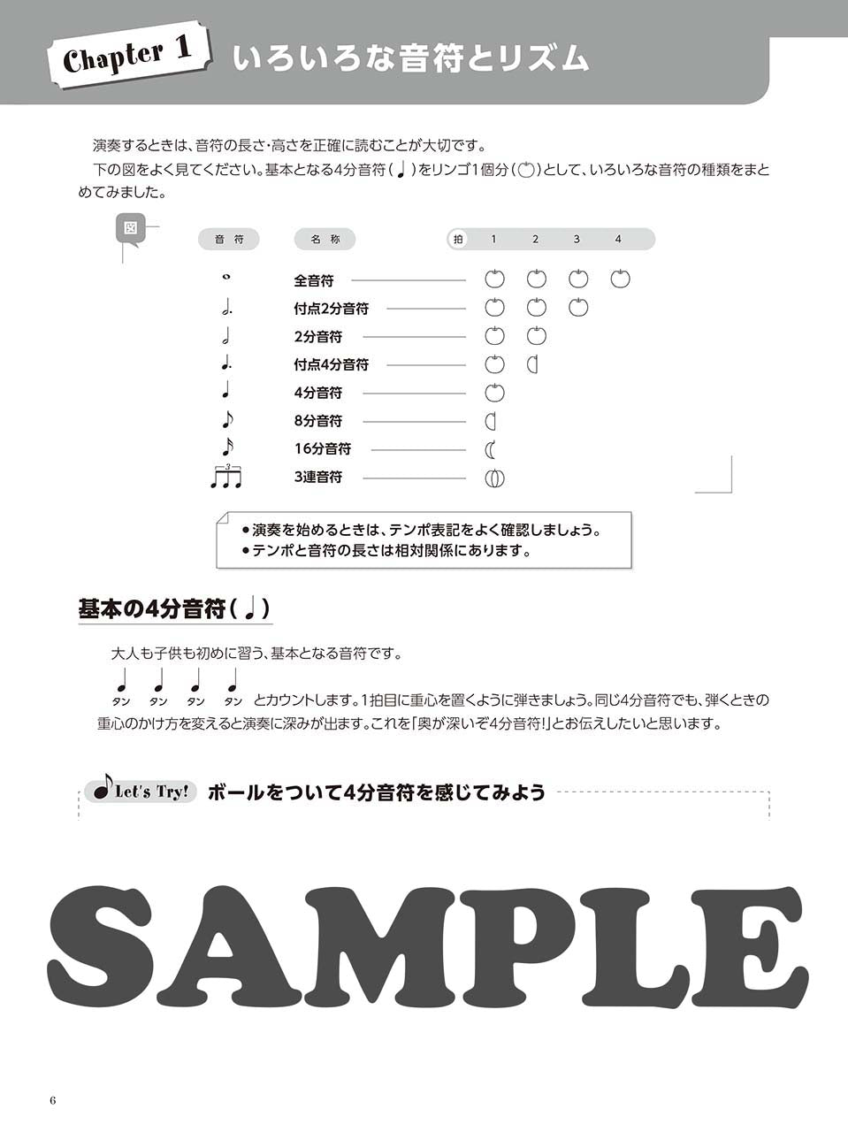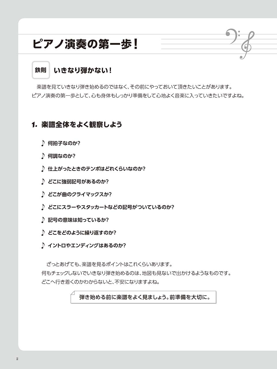 クラシックからジャズ、ポピュラーまで、大人に人気の楽曲を幅広く収載した初級ピアノ曲集『大人のための かんたん!すぐ弾ける!』シリーズより楽曲をセレクト。その楽曲をもとに、「音符の種類」「拍・拍子・リズムの取り方」といった基礎知識から、クラシック独特の「様式美」、ジャズやポップスに必要な「リズム感」や「ノリ」…といった、楽しく音楽を学べる内容までもが盛りだくさん!ちょっとした工夫をすることで演奏に深みが出る、これまでとは一味違う練習法をお教えします。独習者はもちろん、レッスンにもおすすめのピアノ教本です。