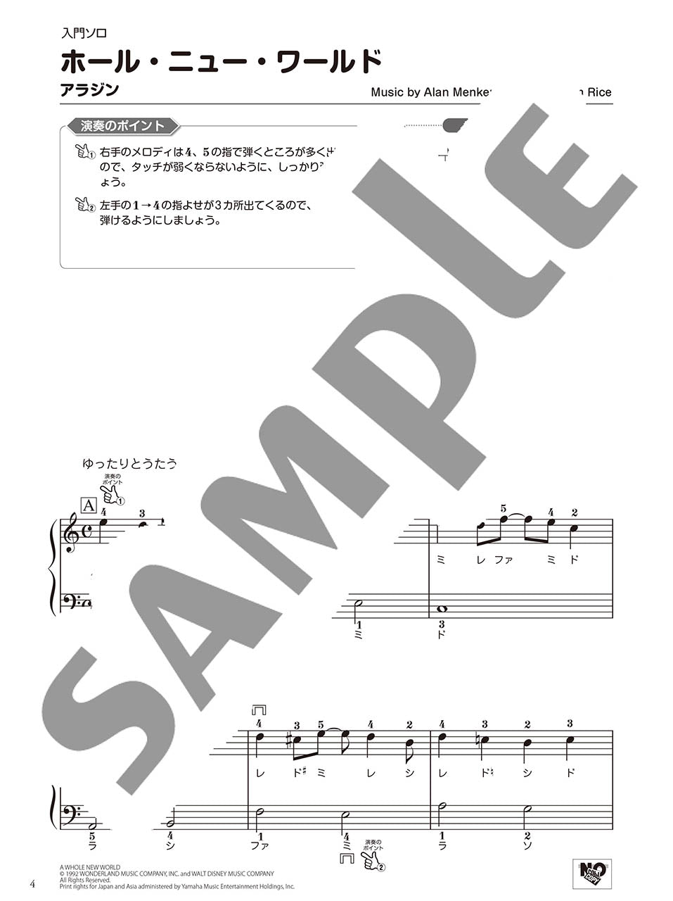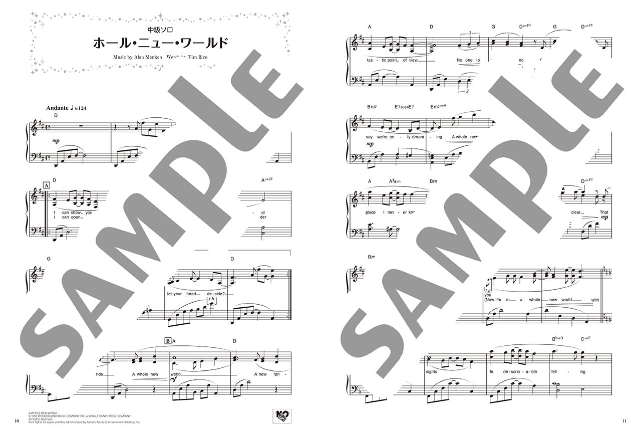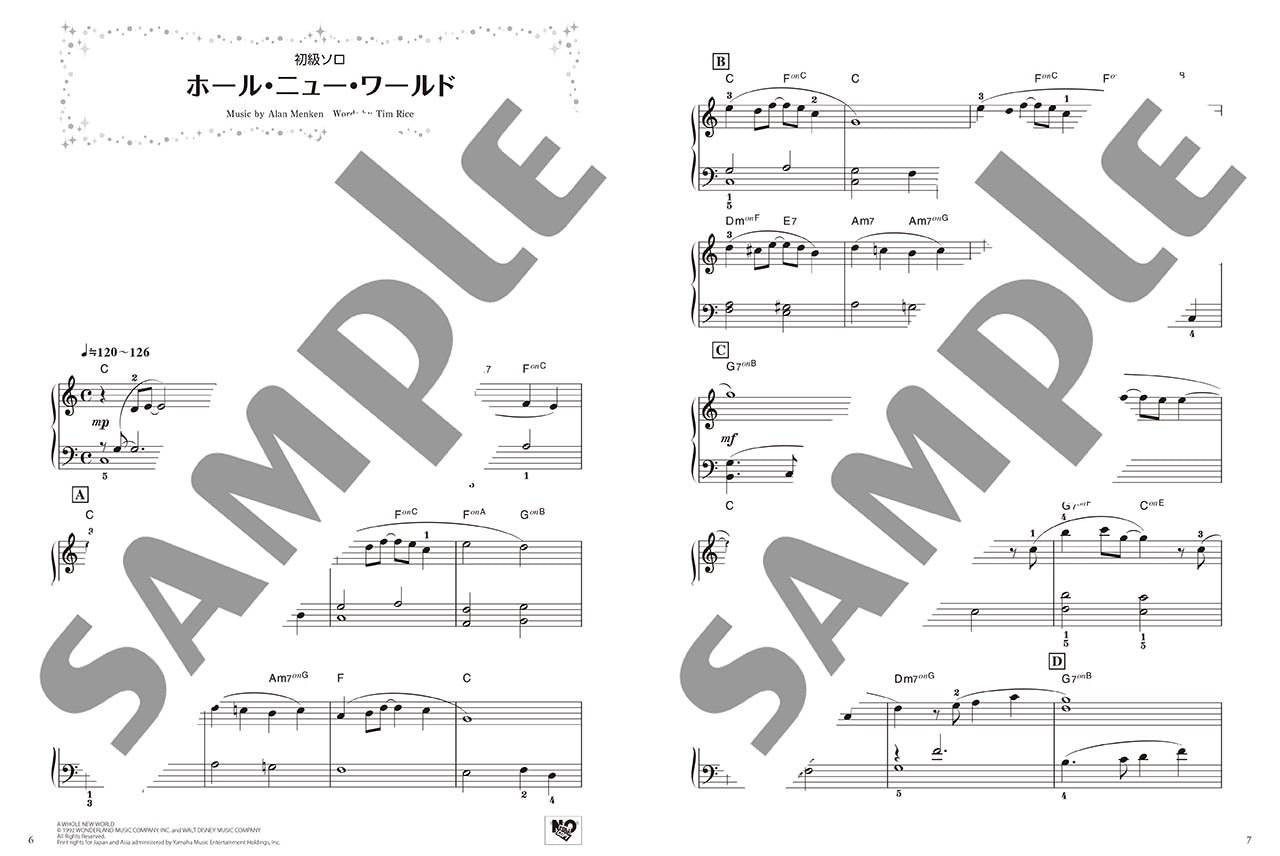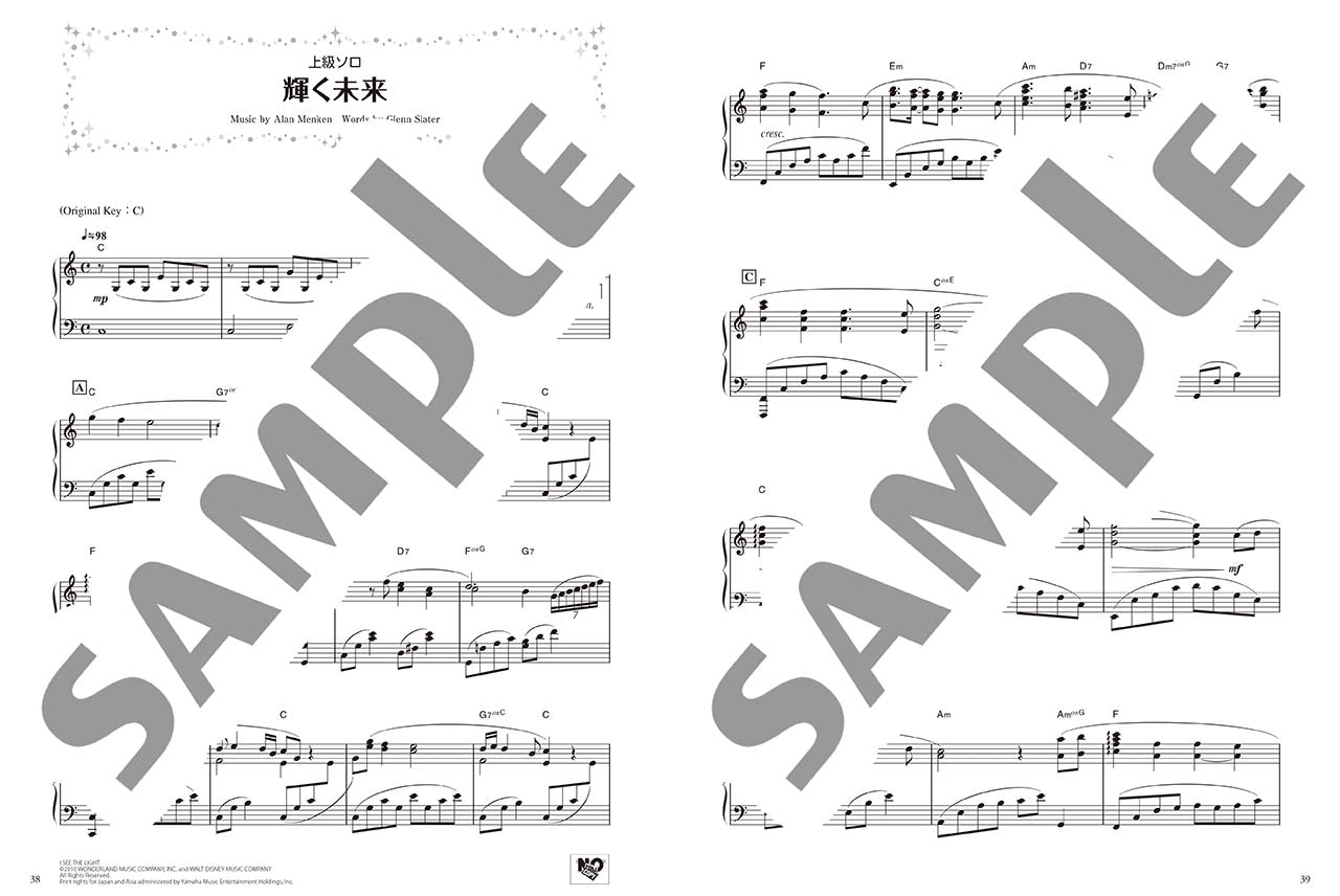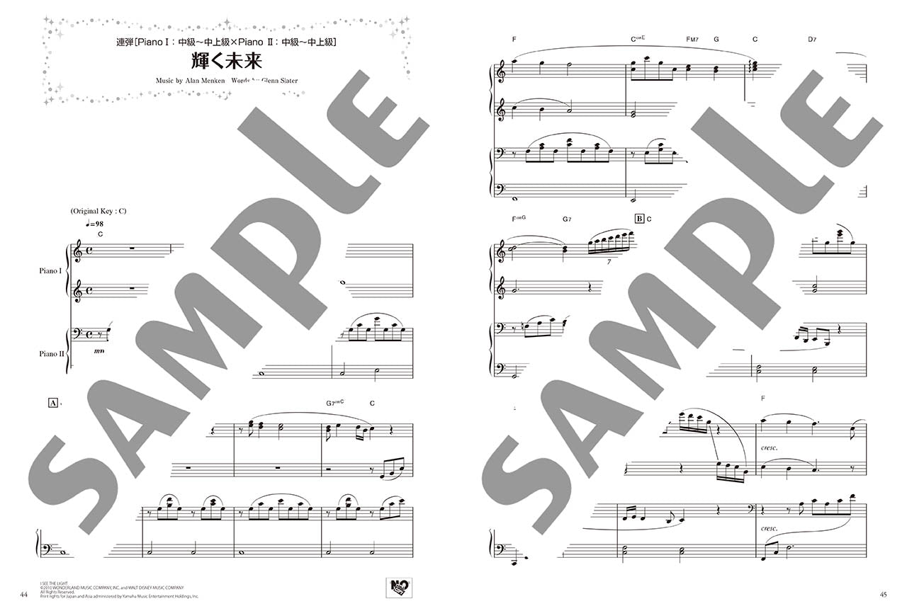 本タイトルでは、「ホール・ニュー・ワールド」(アラジン)「輝く未来」(塔の上のラプンツェル)の各曲について、それぞれ下記の5パターンの楽譜を収載しています。