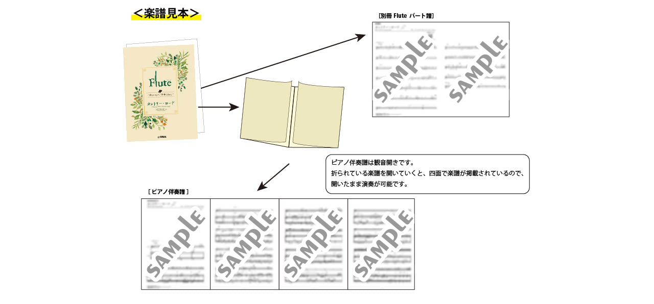 楽譜はソロ用パート譜とピアノ伴奏譜に分かれていて、ピアノ伴奏譜は菊倍縦4面の観音開きなので、譜めくりの必要がなく演奏に集中できます(一部譜めくりが必要な曲もございます)。