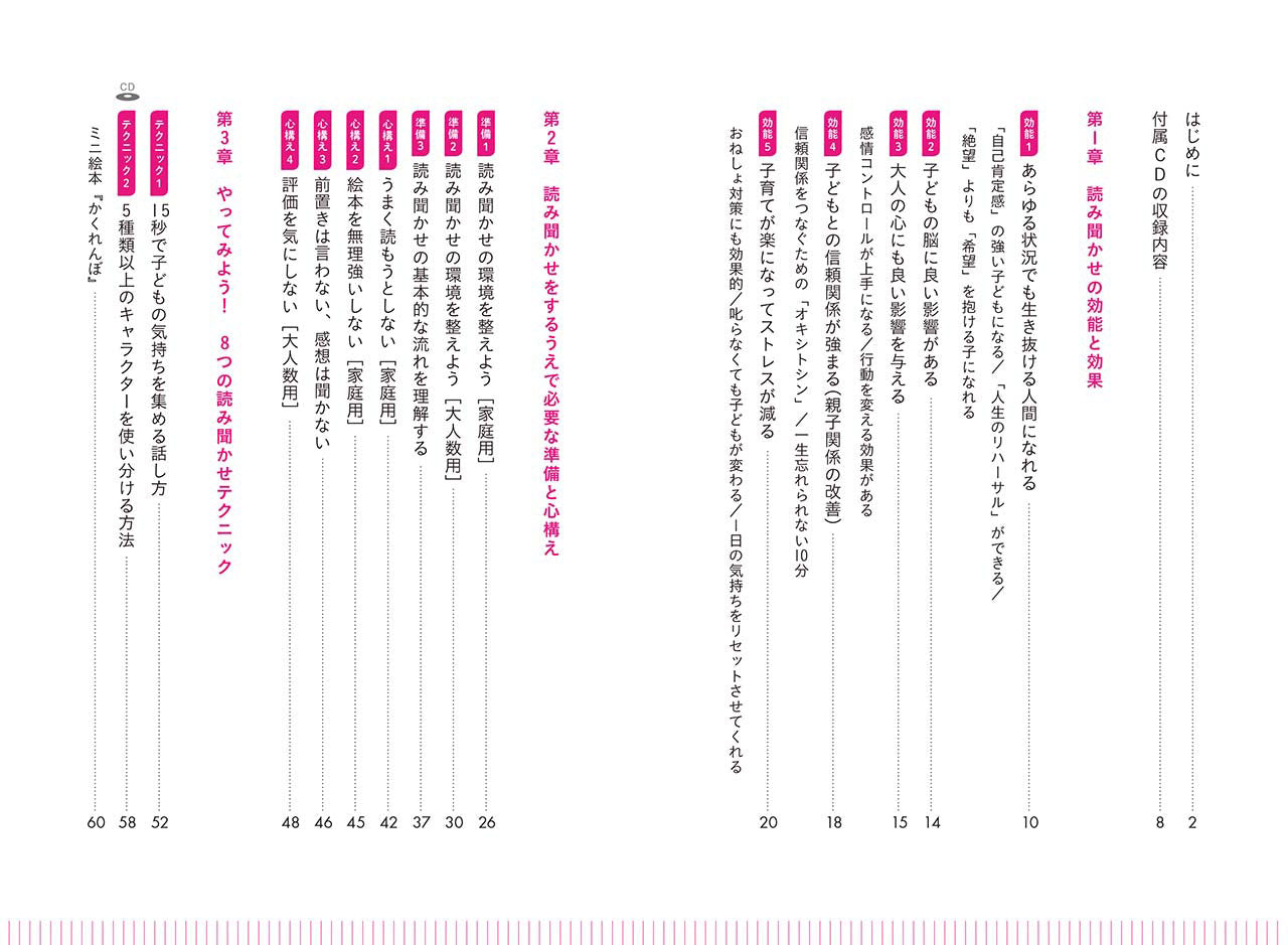 絵本は子どもにとって“体験”の場。ゆえに、子どもに生きる力をつけ、脳にも良い影響を与える。さらに、寝かしつけやおねしょ対策に使えたり、親子関係が改善して、しつけがしやすくなったりと、大人にとっても良いことがたくさん。家庭用での読み聞かせにはもちろん、大人数での読み聞かせ会でも使える簡単テクニックが満載。CDにはテクニックの実演と読み聞かせのサンプルを収録!