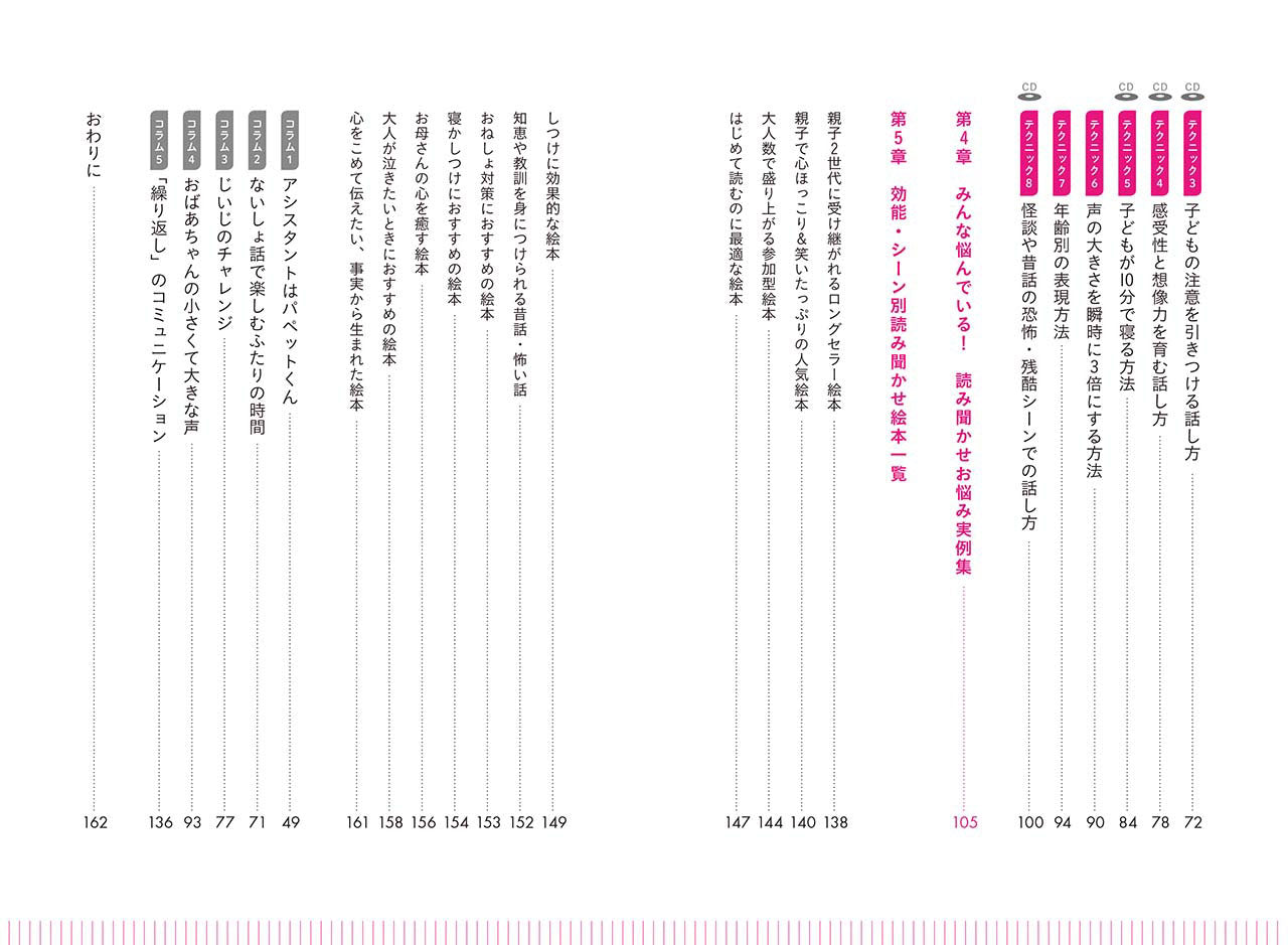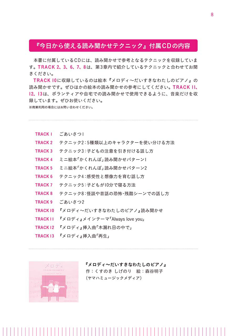 本書で紹介しているテクニックは、付属CDで聞くことができます! さらに、読み聞かせのサンプルも収録しているので、ぜひ参考にしてください。ボランティアや自宅での読み聞かせに使用できるように、音楽のみも収録しています。