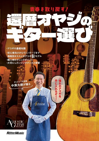 本書では、店主が実際に扱ってきたアコースティック・ギターの中から、還暦オヤジたちに是非お勧めしたい逸品をピックアップ。憧れのマーティンはもちろん、思い出のヤマハやモーリス、懐かしのオベーション、フォーク・ファン垂涎のテリーズテリーなどなど、ビンテージから現行製品までを含めた59機種を、オットリーヤ独自の目線でじっくりと紹介していきます。さらに「主要アコギメーカーとその歴史」、「メンテナンスと保管」、「購入時のチェックポイント」など、アコギ弾きなら知っておきたい基礎知識についても、わかりやすくレクチャーします。