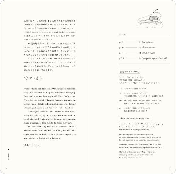 世界的ヴィオリスト今井信子監修のもと、フィンガリングを自ら書き入れ学習していくこれまでにないスケール教本! 今井先生が今も日々の練習に使用している音階が掲載されています。